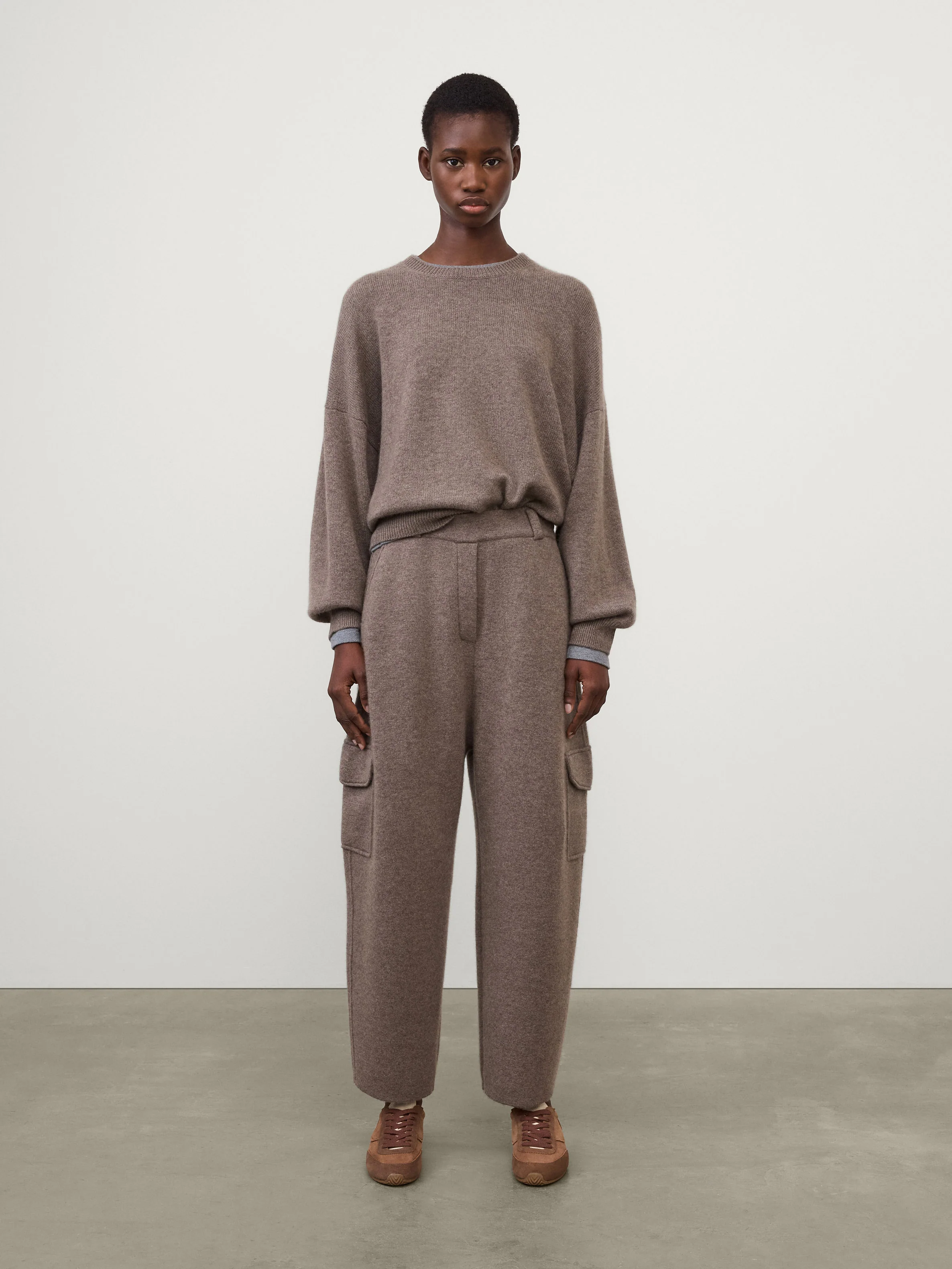 A knitted cargo trouser, the Azaria trouser is crafted in our signature knitted double face cashmere for directional structure. The relaxed fit, barrel silhouette sits comfortably at the waist with an elasticated waistband and falls to voluminous full-length legs that taper at the ankles. It is detailed with a tailoring-inspired faux fly and belt loops and finished with utility-inspired patch pockets.