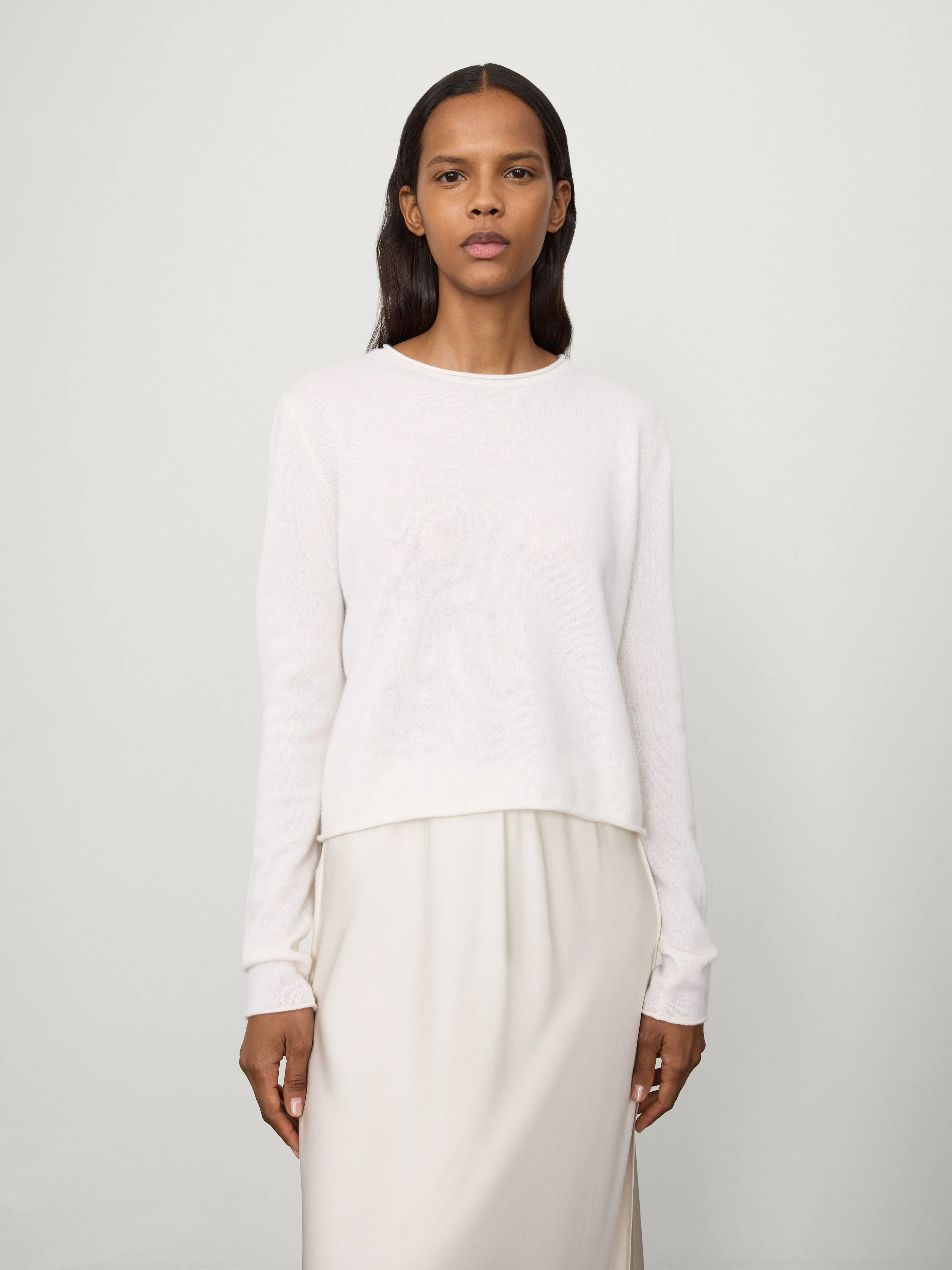 A petite piece with textured accents, the Ida sweater is crafted in soft, mid-weight cashmere for perennial wear. The regular fit and slim, cropped body is contrasted by extended sleeves that drape at the wrists, accentuated by softly rolled edges.